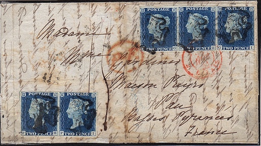 £50,000.00| /Great Britain 1840 2d blue, multiple use on cover, SG 5. A stunning quality and unique letter from London to Pau in France dated November 24th 1841...