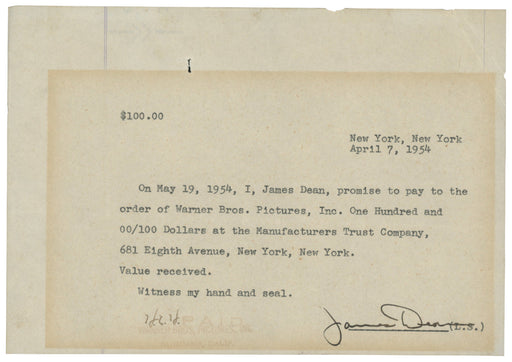 £6,950.00| /Note signed by screen icon James Dean, bearing a superb example of his autograph Dated April 7, 1954 - the same day he signed his first Hollywood ...