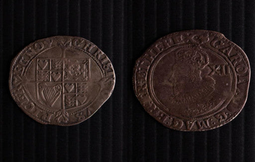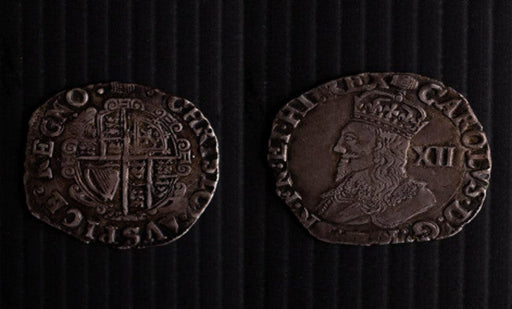 £295.00| /Silver Shilling, stellate lace collar, double arched crown, large value XII in field behind, Latin legend and beaded borders surrounding both sides...