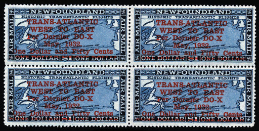 £1,000.00| /Newfoundland 1932 $1.50 on $1 deep blue 'Dornier DO-X', block of 4, SG221, showing the complete setting. Brilliant quality with original gum, (one ...