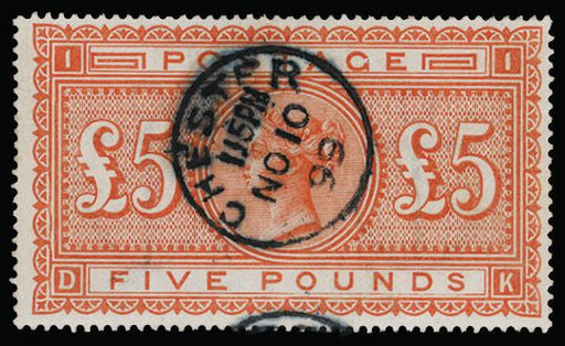 £4,500.00| /Great Britain Queen Victoria Surface Printed 1882 £5 Orange Plate 1, SG137. Very fine used example lettered DK, neatly cancelled by a Chester circ...