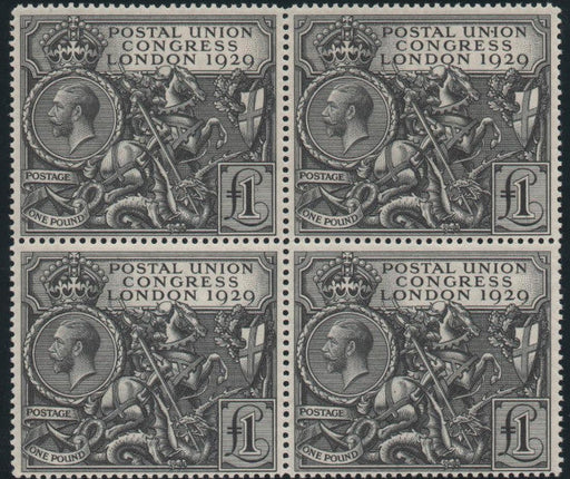 £4,750.00| /Great Britain King George V 1929 £1 Postal Union Congress (P.U.C.) black, SG438. A superb unmounted mint block of four. A beautiful and rare philat...