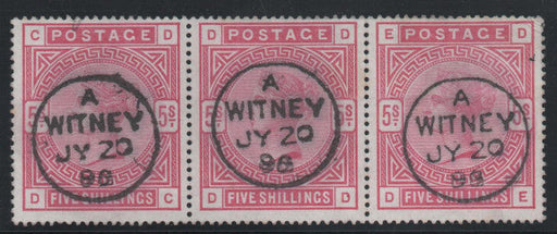 £650.00| /Great Britain Queen Victoria Surface Printed 1884 5s rose, SG180. A superb used horizontal strip of three lettered CD-ED. A philatelic piece of stu...