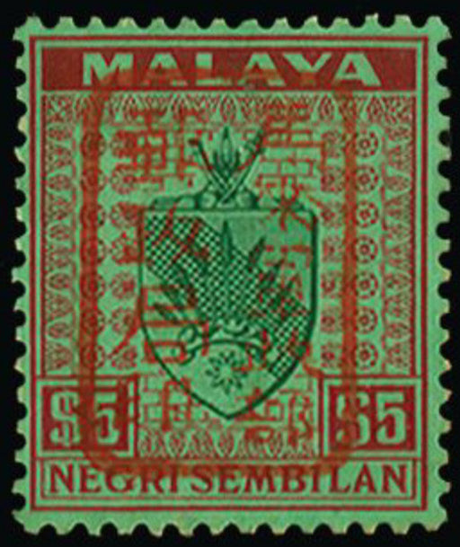 £1,800.00| /Malaya Japanese Occupation 1942 (3 Apr) Negri Sembilan $5 green and red/emerald, chop "D" in red, SGJ175a. In very fine mint condition with origina...