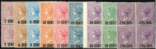 Mauritius 1878 (1 Jan) new currency surcharges set of 9 to 2r50 on 5s, in blocks of four. SG83/91