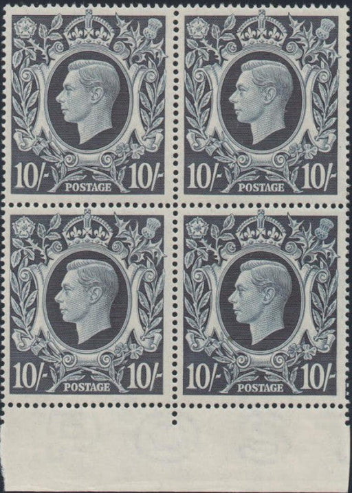 £750.00| /Great Britain 1939 10s. dark blue, fine unmounted mint bottom marginal block of four, SG478. The SG catalogue price for single stamps is £260. Free...