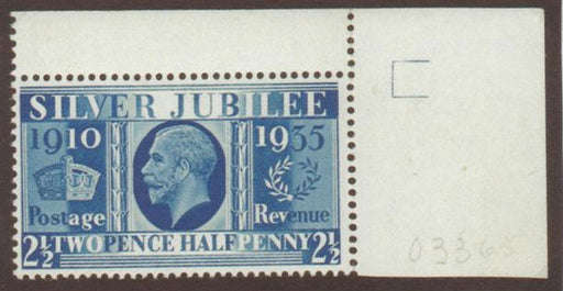 £20,000.00| /Great Britain 1935 Silver Jubilee 2½d Prussian Blue, SG456a. A superb unmounted mint with full original gum example from the top right-hand corner ...