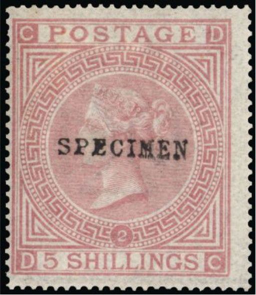 £1,750.00| /Great Britain 1874 5s pale rose plate 2, SG127s. An exceptionally fine and fresh unused original gum example lettered DC, overprinted "SPECIMEN" ty...