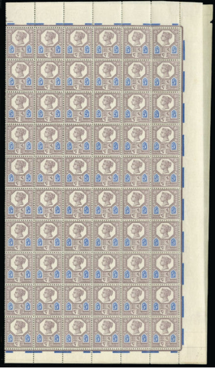 £7,800.00| /Great Britain 1888 5d dull purple and blue, SG207a. Pristine unmounted original gum complete upper pane of 120. Quite spectacular quality and a rea...