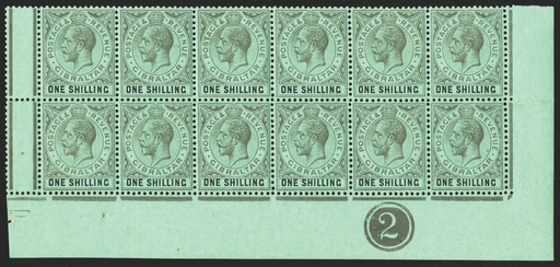 £295.00| /Gibraltar 1912-24 1s black on emerald surface, watermark MCA, block of 12 (6x2) being the bottom two rows of the right pane with full margins showi...