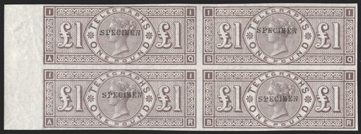 £4,500.00| /Great Britain 1877 £1 brown lilac Telegraphs, SGT17var. Superb unmounted mint, with full original gum, left hand marginal imperforate block of four...