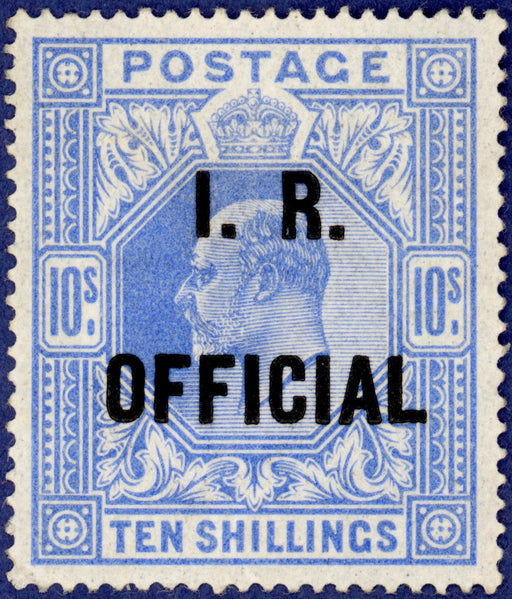 £50,000.00| /Great Britain 1902 10s ultramarine I.R. Official, SGO26. Very fine and fresh unmounted mint example with full original gum. Corner perforation repa...