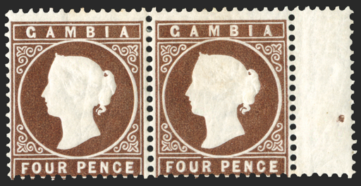 £450.00| /Gambia 1880-81 4d pale brown, watermark CC (upright), COMB perforations from May 1881 third printing, right marginal horizontal pair with guide dot...