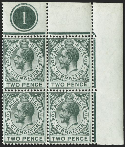 £95.00| /Gibraltar 1912-24 2d greyish slate, watermark MCA, upper right corner block of 4 with plate number '1', SG78. Post Office fresh, brilliant quality ...