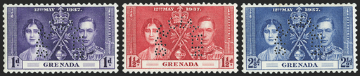 £100.00| /Grenda 1937 King George VI Coronation set of 3, perforated SPECIMEN (type B9), SG149s/51s. Very fine mint set with original gum. Lovely and fresh. ...