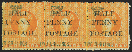 £225.00| /Grenada 1888-91 ½d on 2s orange, type 17 surcharge, horizontal strip of 3, the centre stamp showing variety 'first S in SHILLINGS inverted', SG43/c...