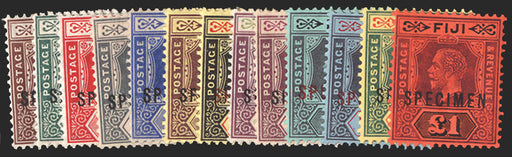 £395.00| /Fiji 1912-13 set of 13 to £1, watermark MCA, overprinted 'SPECIMEN', SG125s/37s. A fine mint set with original gum. A few short perforations and th...