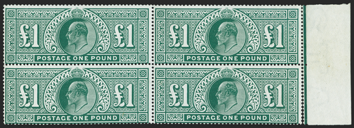£12,500.00| /Great Britain 1911 £1 deep green, SG320. Pristine unmounted mint with full original gum right hand marginal block of four printed at Somerset House...