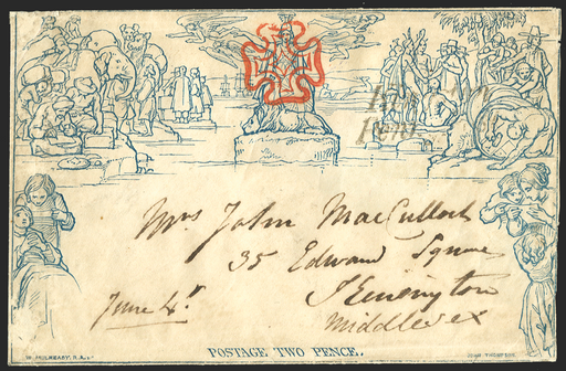 £15,000.00| /Great Britain 1840 1d Mulready Lettersheet (Forme 1, Stereo A11), SGME1,2. Superb used example uprated to the 2d per 1 ounce rate with an additiona...