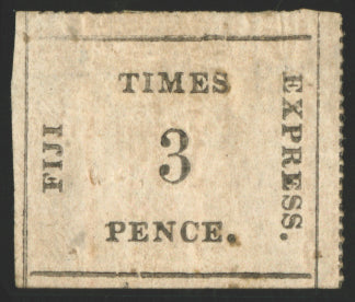 £650.00| /£950.00 Fiji 1870-71 'FIJI TIME EXPRESS' 3d black/rose, thin vertically ribbed paper (with additional thickened lines), R4/1 on the sheet, roulet...