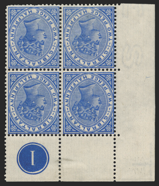 £1,750.00| /Gibraltar 1898 2½d bright ultramarine, upper left corner block of 4 with plate number '1', variety WATERMARK INVERTED, SG42w. A fine and fresh mint...