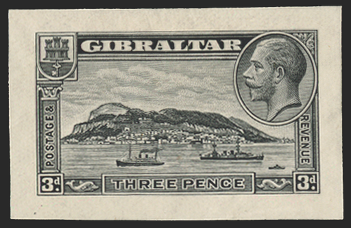 £950.00| /Gibraltar 1933 'The Rock of Gibraltar' 3d die proof in black on thick unwatermarked wove paper (45 x 28mm), SG113. A very fine quality die proof. T...