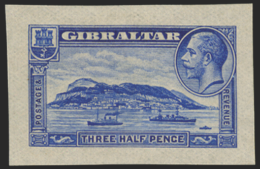 £950.00| /Gibraltar 1931 'The Rock of Gibraltar' 1½d, die proof in bright blue on unwatermarked wove paper (45 x 30mm). A very fine quality die proof. The 1½...