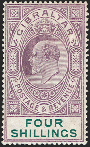 £350.00| /Gibraltar 1904-08 4s deep purple and green, watermark MCA, SG63. A lovely and fresh mint example with large part original gum. Very fine quality fo...