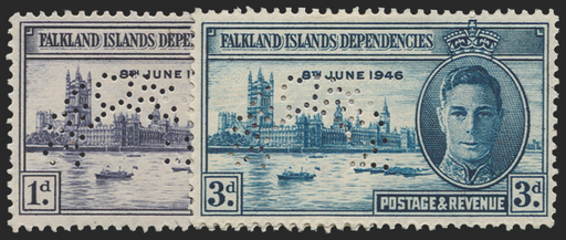 £295.00| /Falkland Islands Dependencies 1946 Victory 1d deep violet and 3d blue, perforated 'SPECIMEN' (type D21), SG17s/18s. Brilliant mint quality with ori...