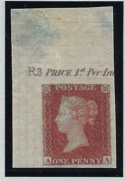 £1,625.00| /Great Britain 1854 1d Red Brown plate R3. SG17var Superb unused top left hand corner marginal imperforate imprimartur lettered AA ,showing part she...