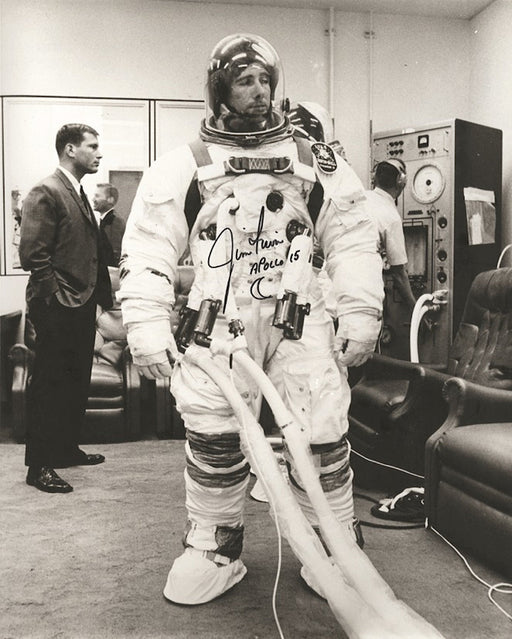 £995.00| /A black and white signed photograph of Apollo 15 Lunar Module pilot Jim Irwin, the eighth man on the moon James Irwin (1930 – 1991) was an Ameri...