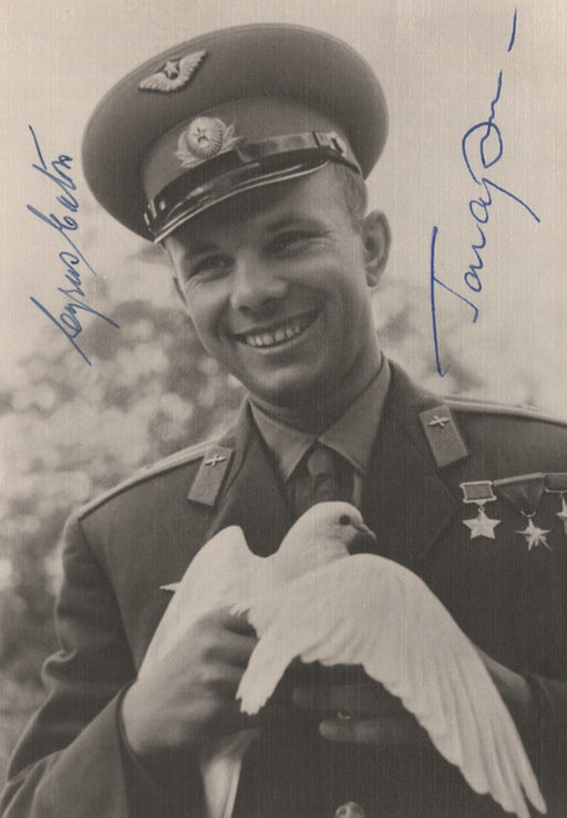 £1,500.00| /A black and white photograph postcard signed by the pioneering Soviet cosmonaut Yuri Gagarin, the first human being in space. Yuri Gagarin (193...