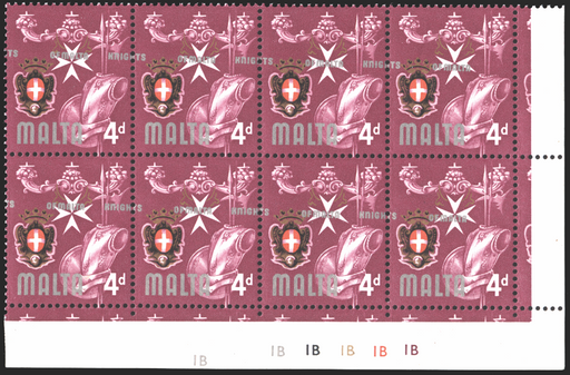 £135.00| /Malta 1965-70 4d 'Knights of Malta', lower right corner block of 8 (4x2) with '1B' (x6), showing DRAMATIC LEFT DIAGONAL SHIFT OF 'KNIGHTS OF MALTA'...