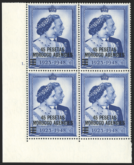 £85.00| /Morocco Agencies 1948 Royal Silver Wedding 45p on £1 blue, SG177. A lower left corner block of 4 showing cylinder number '1.', unmounted mint with ...