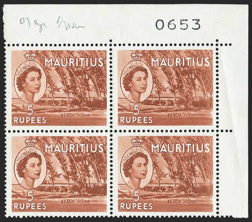 £225.00| /Mauritius 1953-58 5r orange-brown, "Beach Scene" 19.6.57 printing, SG305a. An upper right corner block of 4 with '0653' sheet number, unmounted min...