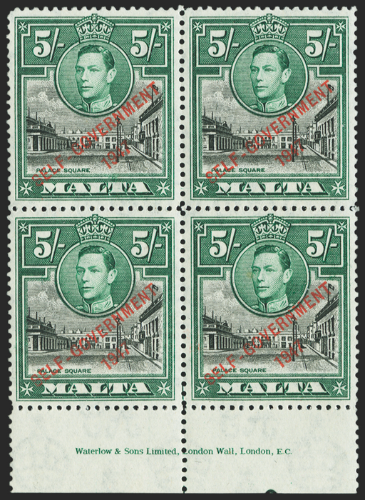 £150.00| /Malta 1948-53 'SELF-GOVERNMENT' 5s black and green, SG247. A stunning unmounted mint, with full original gum, block of four with imprint. A highly ...
