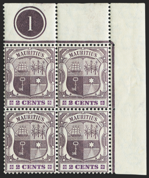 £195.00| /Mauritius 1904-07 2c dull and bright purple "Coat of Arms" watermark MCA, ordinary paper from first printing, SG165. An upper right corner block of...