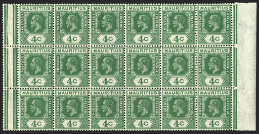 £195.00| /Mauritius 1921-34 4c green, script watermark, reversion to die I, SG226c. A stunning block of 18 (6x3) being three rows from the right pane with bo...