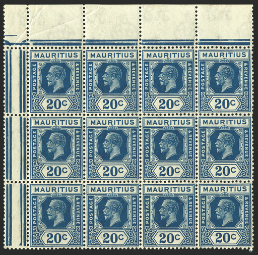 £225.00| /Mauritius 1921-34 20c Prussian blue, script watermark, die II, SG235a. An upper left corner block of 12 (4x3) from right pane, showing noticeable C...