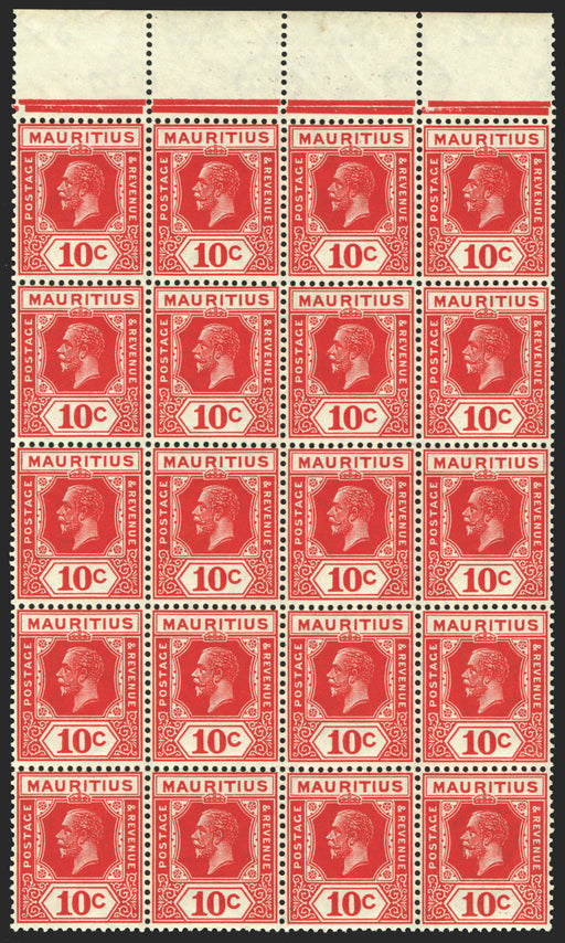 £75.00| /Mauritius 1921-34 10c carmine-red, Script watermark, die II, upper marginal block of 20 (4x5) in the distinctive deep shade of the 1935 printings (...