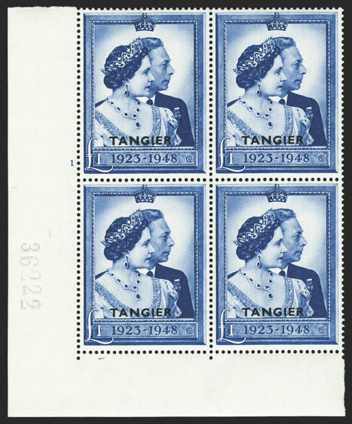 £95.00| /Morocco Agencies Tangier 1948 Royal Silver Wedding £1 blue, block of 4 from lower left corner showing cylinder number '1' and sheet number '36222',...