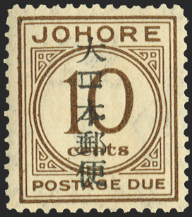 £375.00| /Malaya Japanese Occupation 1943 Johore Postage Due 10c brown, type 2 'Kanji' overprint showing variety 'Second character sideways' (R6/3), SGJD9a. ...