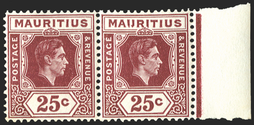 £225.00| /Mauritius 1938-49 25c brown-purple, ordinary paper, SG259b/ba. A right marginal horizontal pair, showing the 'IJ' flaw on right stamp (right pane, ...