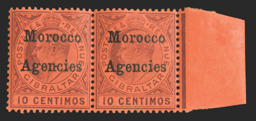 £65.00| /Morocco Agencies 1903-05 10c dull purple/red, watermark CA, SG18c. Brilliant mint example with original gum horizontal pair from right of sheet sho...