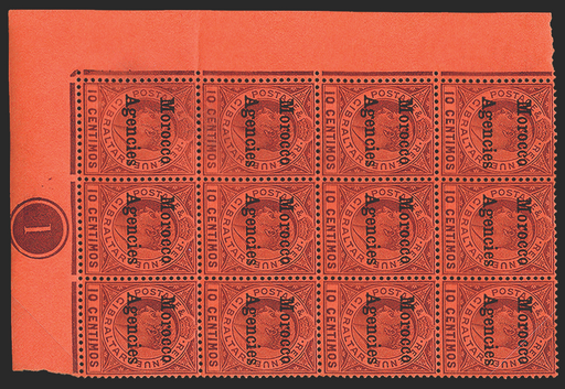 £295.00| /Morocco Agencies 1905-06 10c dull purple/red, watermark MCA, ordinary paper, SG25b. A fine and fresh mint lower left corner plate '1' block of 12 (...