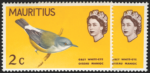 £325.00| /Mauritius 1965 Birds 2c lemon 'Bourbon White Eye', error with GREY (leg) OMITTED, SG317a. A very fine unmounted mint example with full original gum...