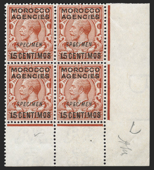 £450.00| /Morocco Agencies 1914-26 Spanish Currency 15c on 1½d red-brown, watermark Simple Cypher, overprinted 'SPECIMEN' (type GB23), lower right corner blo...