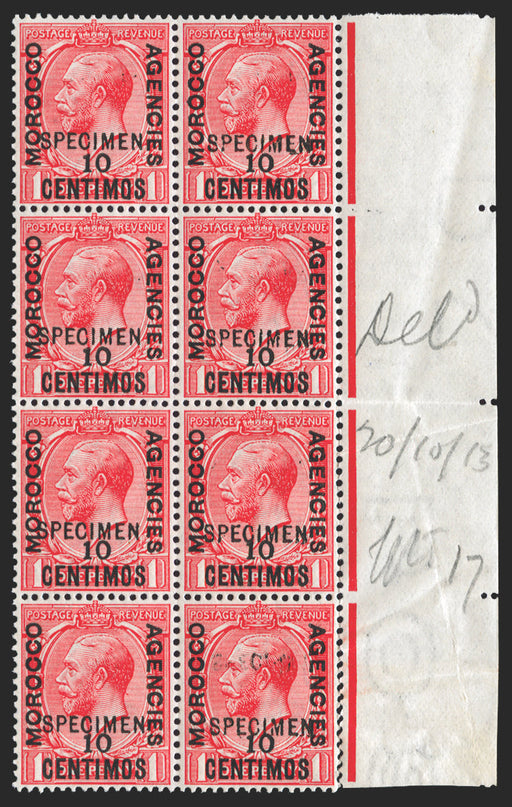 £750.00| /Morocco Agencies 1914-26 Spanish Currency 10c on 1d scarlet, watermark Simple Cypher, overprinted 'SPECIMEN' (type GB26), right marginal block of 8...