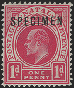 £95.00| /South Africa Natal 1902-03 1d carmine, overprint 'SPECIMEN', showing the constant variety 'Broken M' (pos. 41 of the setting), SG128svar. A brillia...