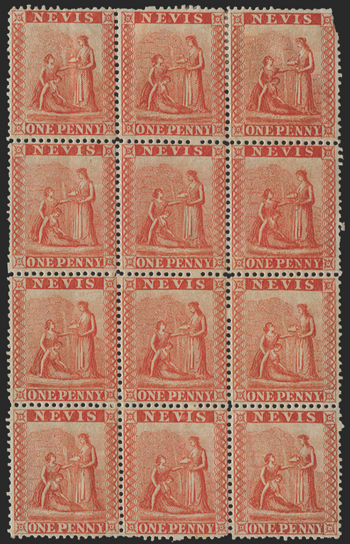 £550.00| /Nevis 1867-76 1d pale red, recess printing on white paper, perforations 15, SG9. A highly attractive mint SHEET OF TWELVE (3x4) without margins, wi...
